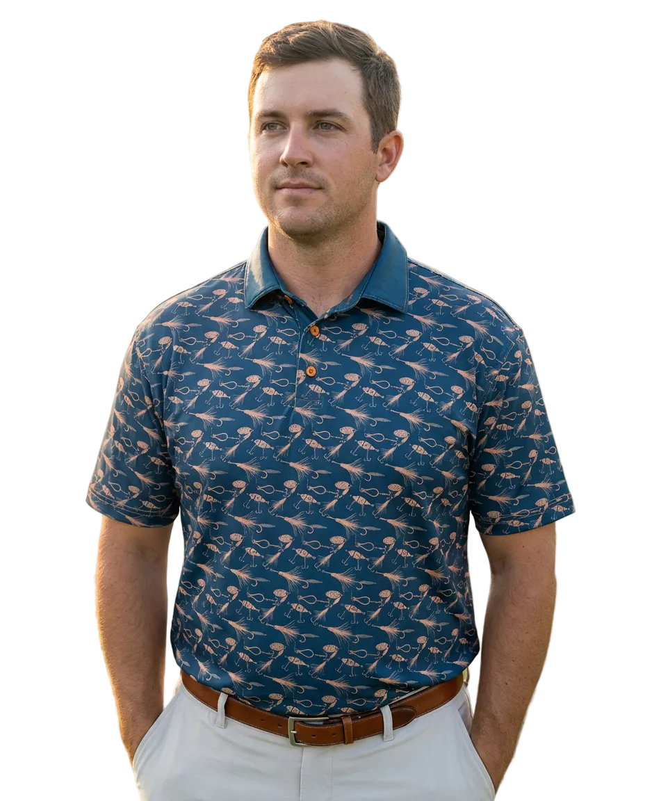 The So Fly Polo features a classic fly-lure pattern that brings a bold, outdoorsman edge to a performance golf polo. Built for guys who split their days between the course and the water. Tough, breathable, and ready for real adventure—whether you’re casting, swinging, or doing both in one weekend.